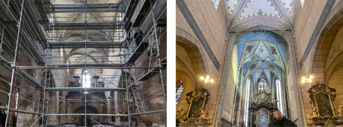 Letos započala první etapa obnovy výmalby hlavní lodi kostela sv. Gotharda ve Slaném, který byl založen ve 12. století. Úsek zahrnoval první klenební pole u presbytáře spolu s vítězným obloukem.